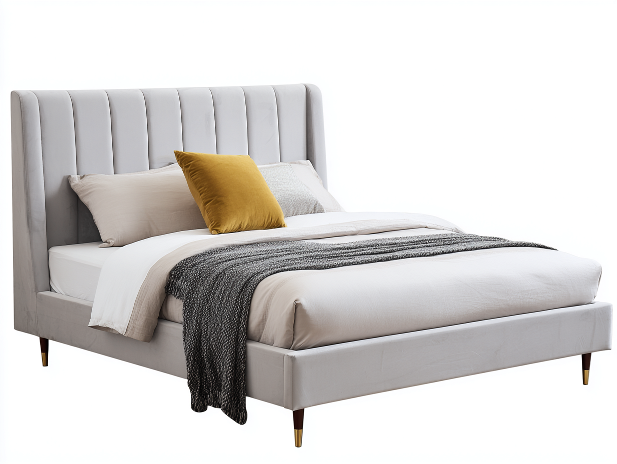 Questo letto matrimoniale imbottito è progettato per offrire comfort e stile alla camera da letto moderna. La testiera alta con pannellatura verticale crea un effetto visivo ordinato e raffinato, rendendo il letto un elemento centrale dell’arredo, ideale per ambienti contemporanei e curati.