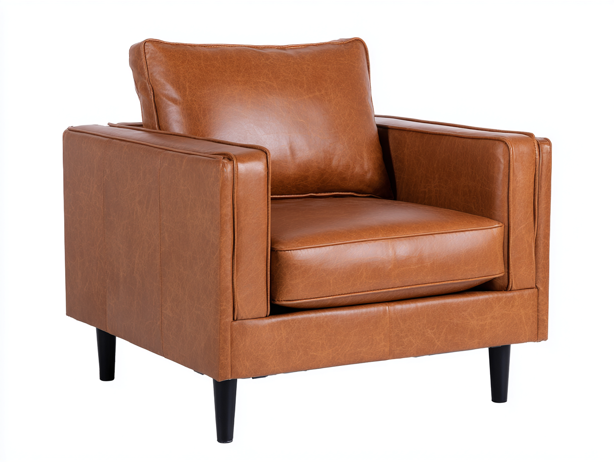 La poltrona è rivestita in pelle di colore marrone cognac con finitura naturale, che mette in risalto la grana e le leggere variazioni cromatiche tipiche del materiale. L’imbottitura della seduta e dello schienale assicura comfort e sostegno, mentre la struttura interna garantisce stabilità nell’uso quotidiano. I piedini in metallo contribuiscono a una base solida e resistente.