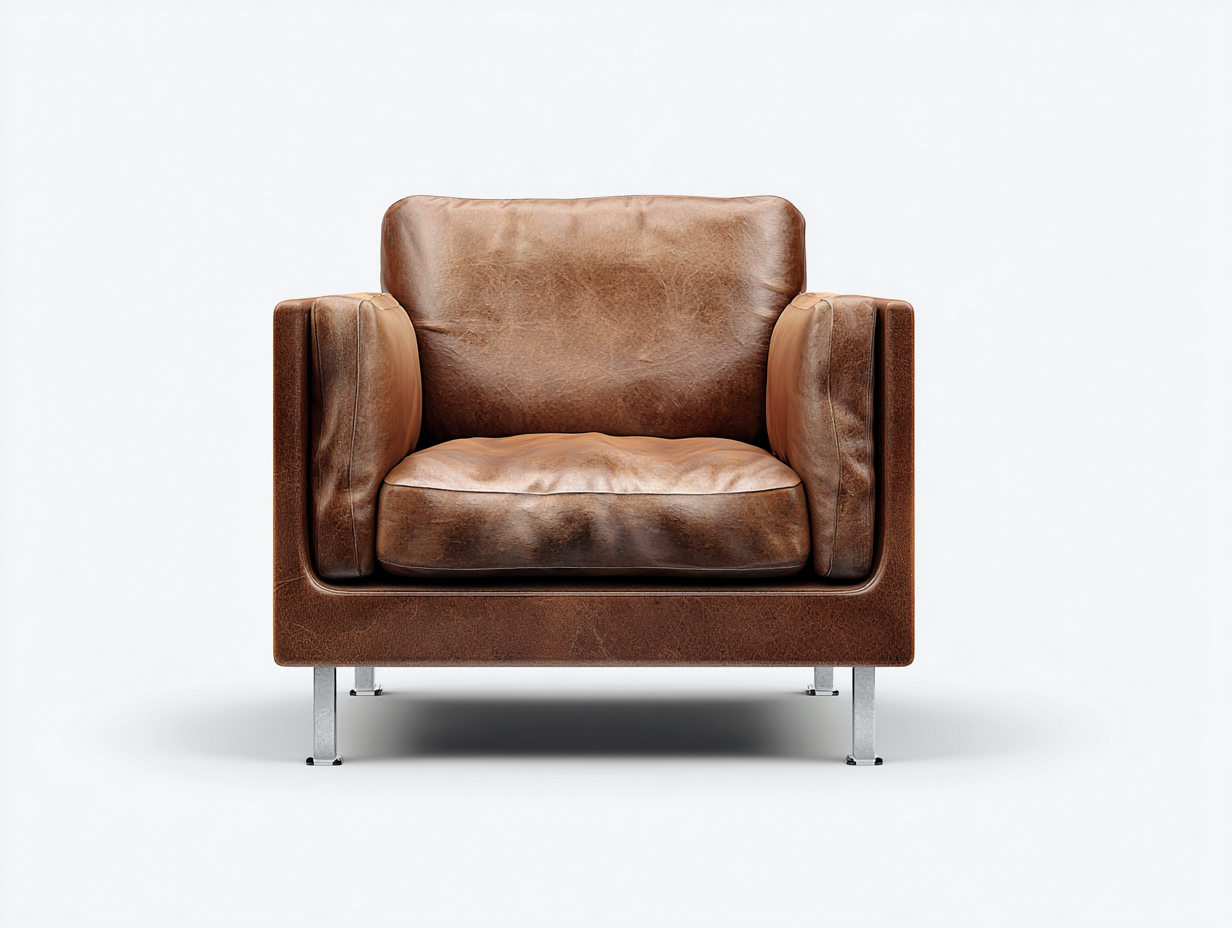 La struttura è rivestita in pelle di colore marrone con finitura naturale, caratterizzata da una texture visibile e gradevole al tatto. La base è sostenuta da piedini in metallo che garantiscono stabilità e resistenza nell’uso quotidiano. Le cuciture regolari contribuiscono a una buona durata nel tempo.