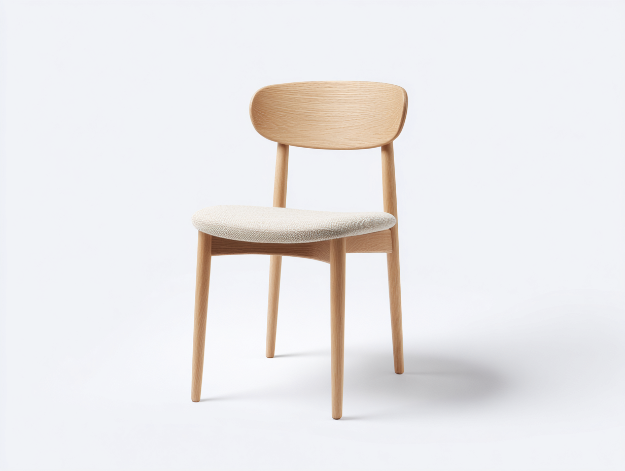 La struttura è realizzata in legno massello con finitura rovere naturale, che mette in risalto le venature autentiche del legno. La seduta è rivestita in tessuto chiaro, piacevole al tatto, mentre lo schienale sagomato in legno offre un sostegno ergonomico. Le superfici sono accuratamente rifinite per garantire durata e stabilità nell’uso quotidiano.